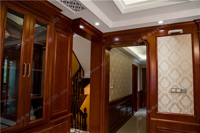 案例詳情:該別墅整木定制一層全部選用北美櫻桃純實木材質制作,簡潔大氣。純實木材質配和水色效果的油漆工藝,木紋肌膚得以呈現,既大氣又穩重!