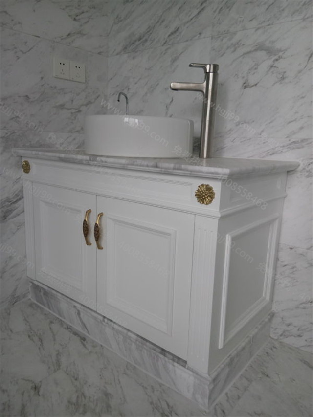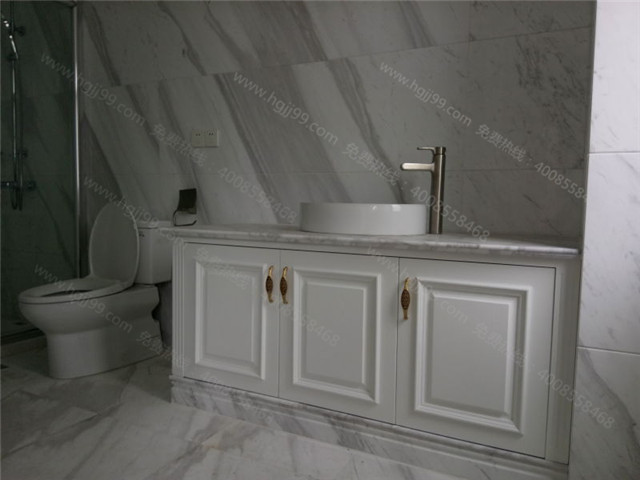 通體白色的方形臺盆看起來恰到好處,也符合衛浴間的整體形狀。方形臺盆下端衛浴柜同樣采用白色款式,衛生間整體顯干凈利落。